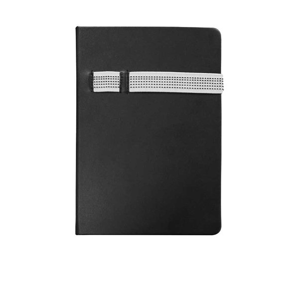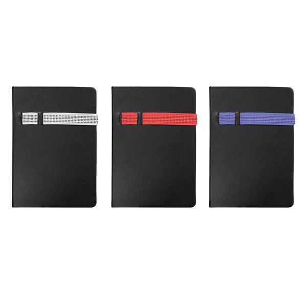 The notebook features a smooth, flexible, and durable PU cover in elegant black, paired with an elastic strap available in three attractive colors—Grey, Blue, and Red. Its compact and lightweight design makes it easy to carry in bags, backpacks, and suitcases.