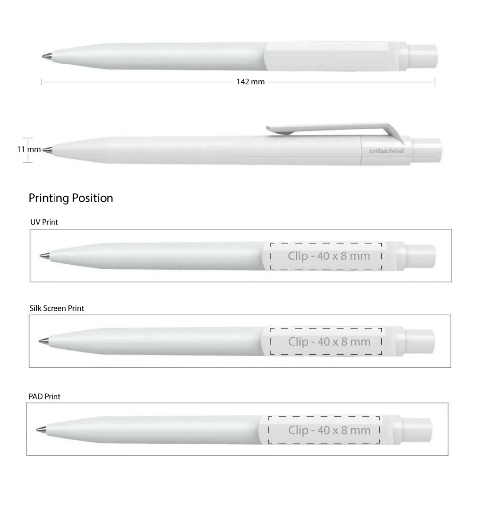 The Maxema Dot Antibacterial Pens are a perfect blend of quality, safety, and style. Made from recyclable, non-toxic ABS plastic, these pens are antibacterial, eliminating microorganisms on contact and ensuring safe everyday use. The pen features a metallic white barrel with a shiny, reflective finish, giving it an elegant metallic sheen.