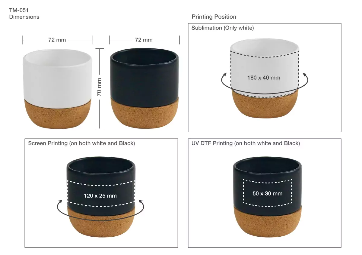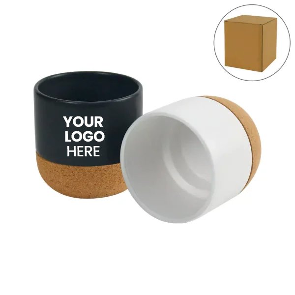 Modern Ceramic Cup with Cork Base (6 oz) featuring a sleek matte finish and eco-friendly cork bottom. Perfect for coffee, espresso, or tea, these cups combine style, comfort, and practicality. Available in black and white, customizable through Screen Printing, Sublimation, or DTF Printing — a perfect gift or promotional product.