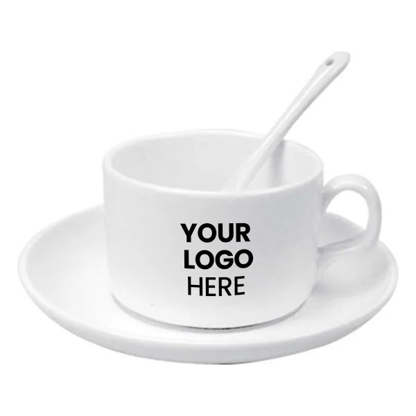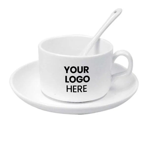 Elegant Ceramic Saucer Teacups with Spoon — crafted from durable ceramic with a sleek white finish. Perfect for tea or coffee, this 120 ml cup set includes a matching saucer and spoon. Ideal for restaurants, cafés, and promotional gifting. Customizable through Sublimation Printing for your logo or brand design.