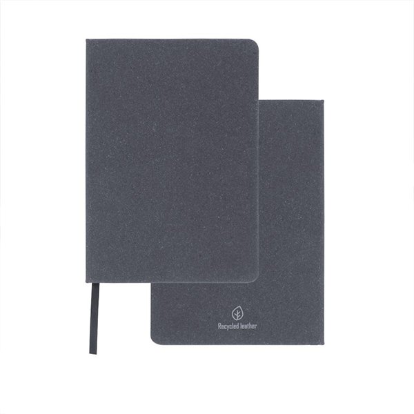 Stylish and eco-friendly, the Dorniel A5 Notebook features a recycled leather hardcover in stone grey with smooth white pages and a page mark ribbon. Perfect for corporate gifting, branding, or everyday note-taking.