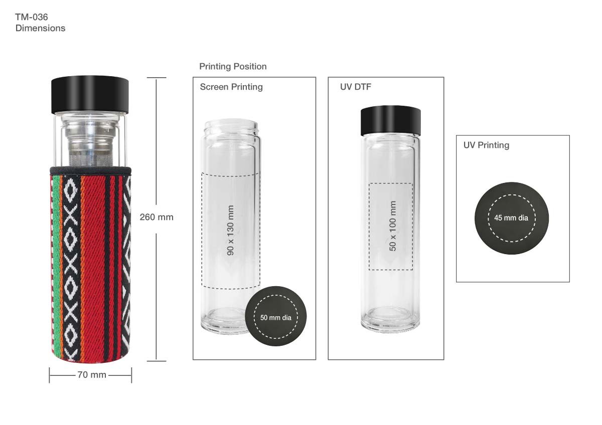 500ml double wall glass bottle with SADU sleeve, black lid, and tea infuser. Durable, stylish, and customizable with screen or UV printing.