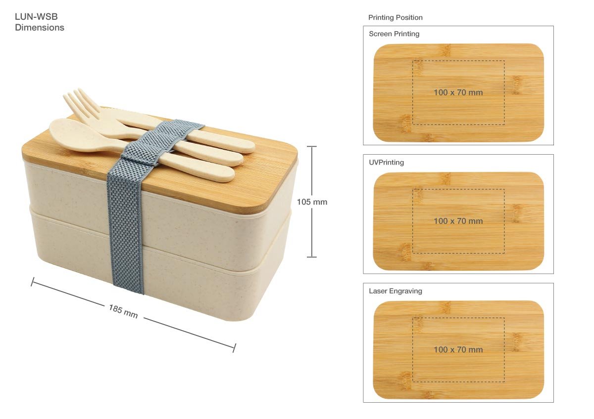 Eco-friendly lunch box made from durable wheat straw with a bamboo lid, two compartments, and included cutlery set. Lightweight, portable, and customizable with UV, laser, or screen printing. Ideal for corporate gifting or daily use.