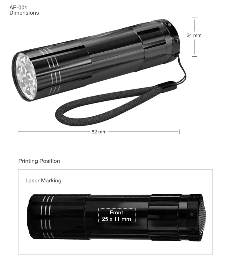 These branded flashlights are customizable with laser marking, a premium and long-lasting printing method that ensures your logo or company name remains clear and attractive over time. Laser-marked branding enhances the overall appearance of the flashlight and increases brand visibility.