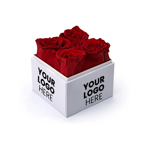 Elegant gift box featuring 4 preserved long-life red roses in a white hardboard box with a transparent acrylic lid. Perfect for birthdays, anniversaries, corporate gifting, or any special occasion.