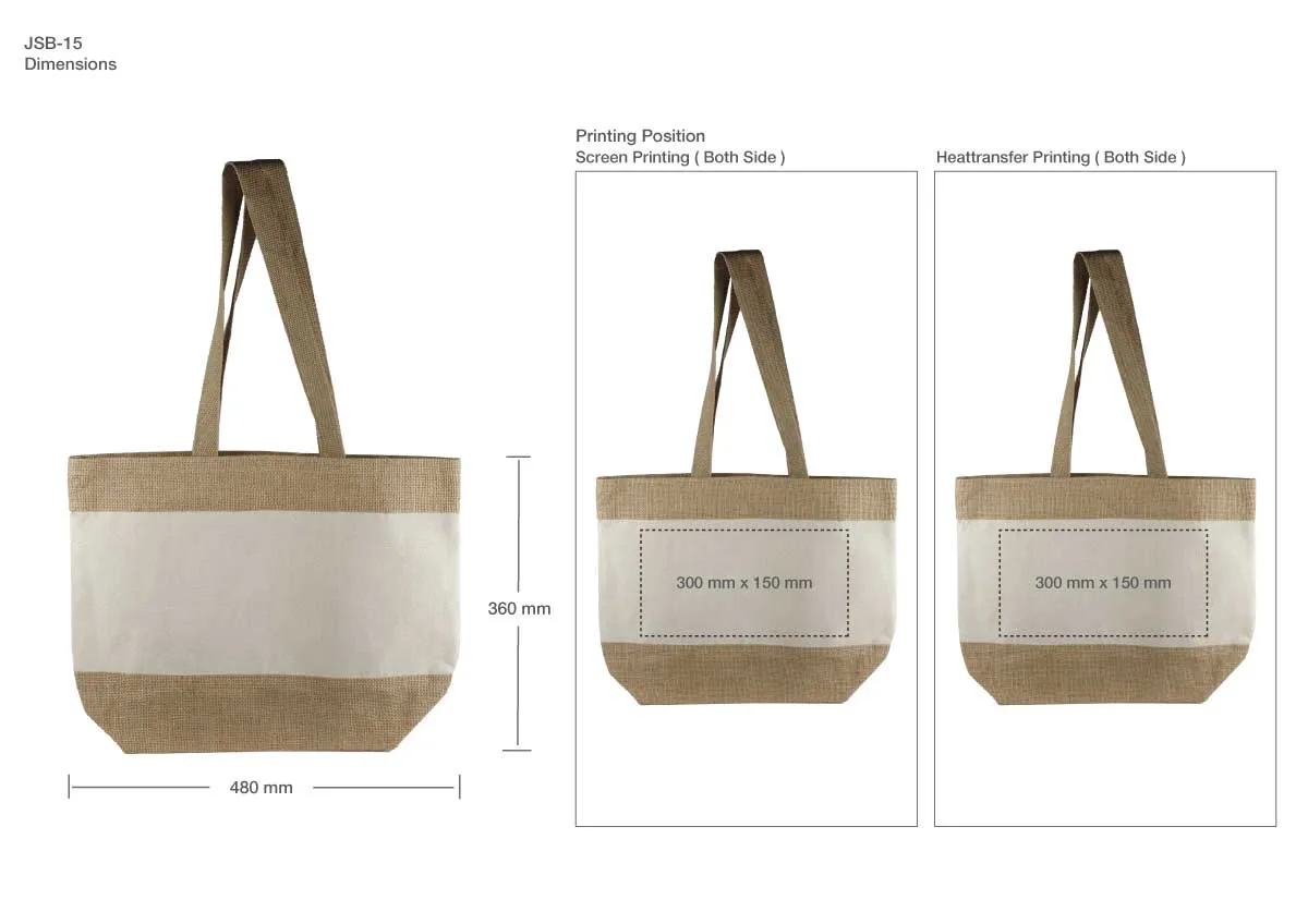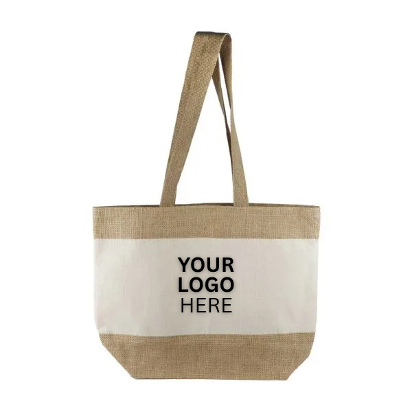 Eco-friendly Laminated JUCO Beach Bags with long handles, crafted from jute and cotton. Spacious, durable, and perfect for beach outings, retail, corporate giveaways, or promotional events. Customizable with screen or heat transfer printing.