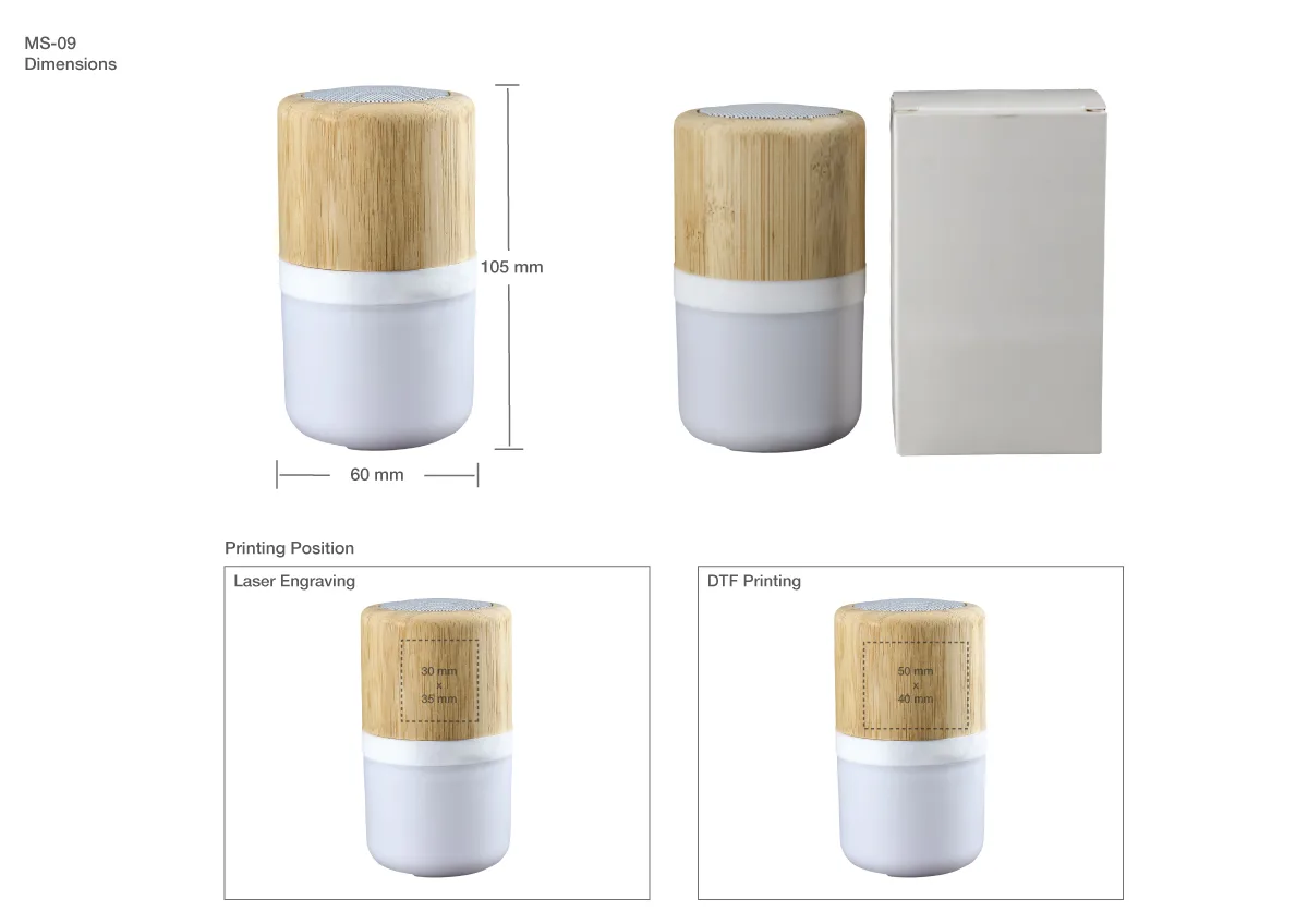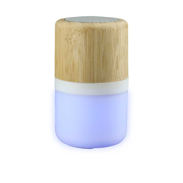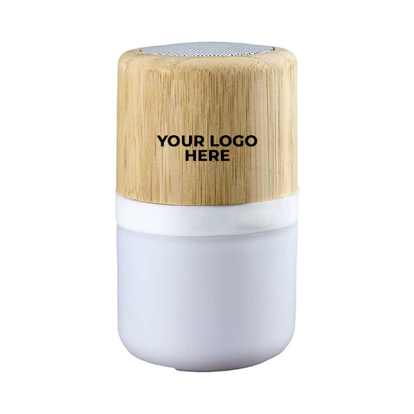 A stylish and eco-friendly Bluetooth speaker made with a bamboo top and a lamp at the bottom. This 2-in-1 speaker and lamp is perfect for promotional gifts, corporate events, and personal use.