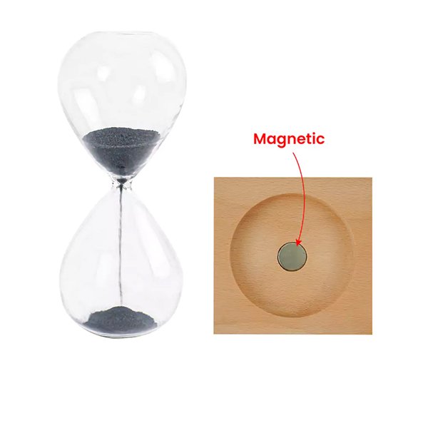 Experience time in a visually captivating way with our Magnetic Sand Timer with Wooden Base – 2 Minutes. This unique timepiece features fine iron sand filings in a glass container that are attracted to magnets in the wooden base, forming intricate and ever-changing patterns as the timer runs.