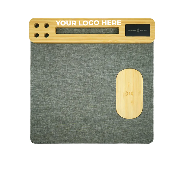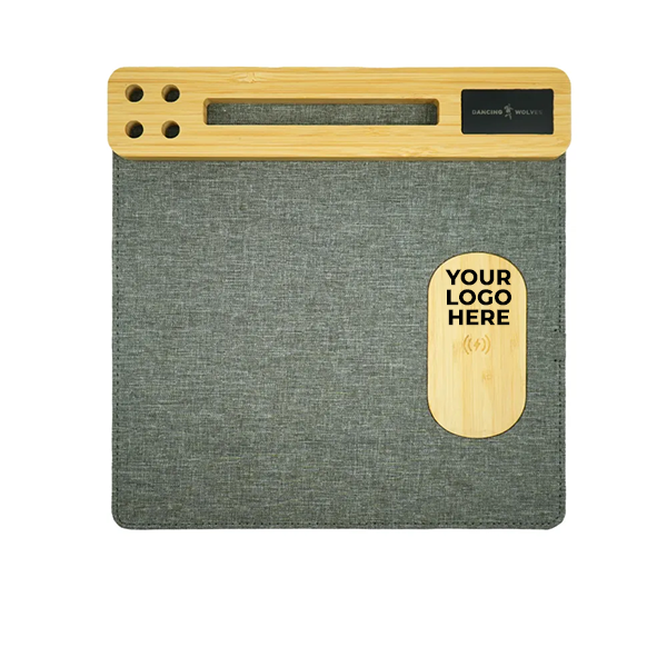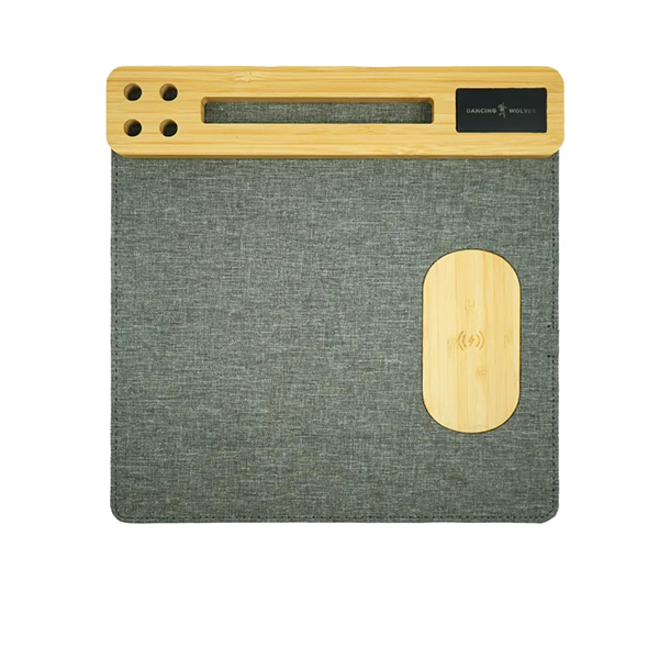 This multi-function mousepad is made from a polyester fabric base and features a bamboo organizer with a phone holder, pen holder, and card slot. It combines desk organization, wireless charging, and modern design in one practical product.