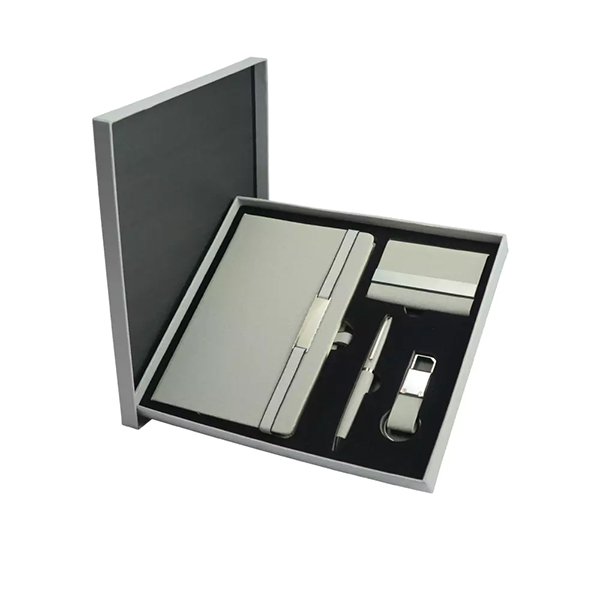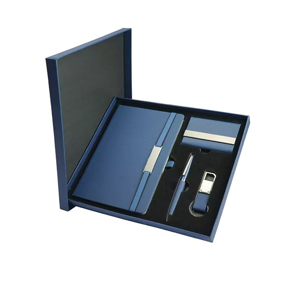 Premium Office Gift Set including a notebook, pen, card holder, and keychain. Packaged in a stylish box, perfect for corporate gifting, employee appreciation, and promotional campaigns. Customizable with branding options.