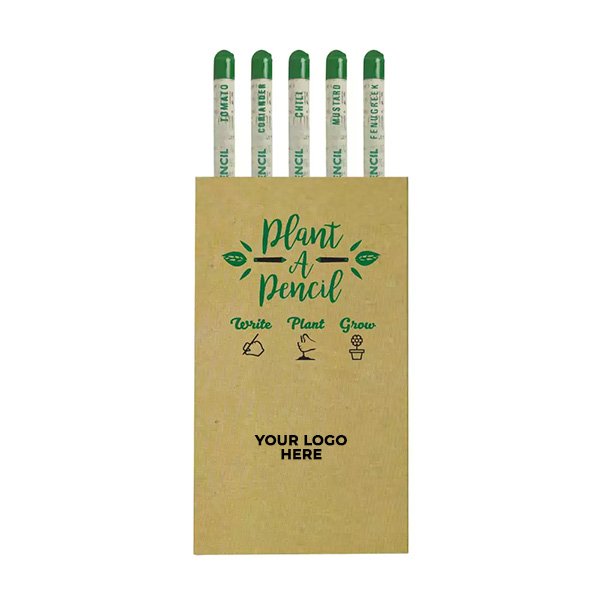 The Plantable Pencil Set is an innovative and eco-friendly promotional product that combines practical writing with sustainability. Each pencil is made from 100% recycled newspaper and contains embedded seeds for Tomato, Coriander, Chili, Mustard, and Fenugreek. When the pencil becomes too short to use, it can be planted in soil, watered, and grown into a thriving herb or vegetable plant.