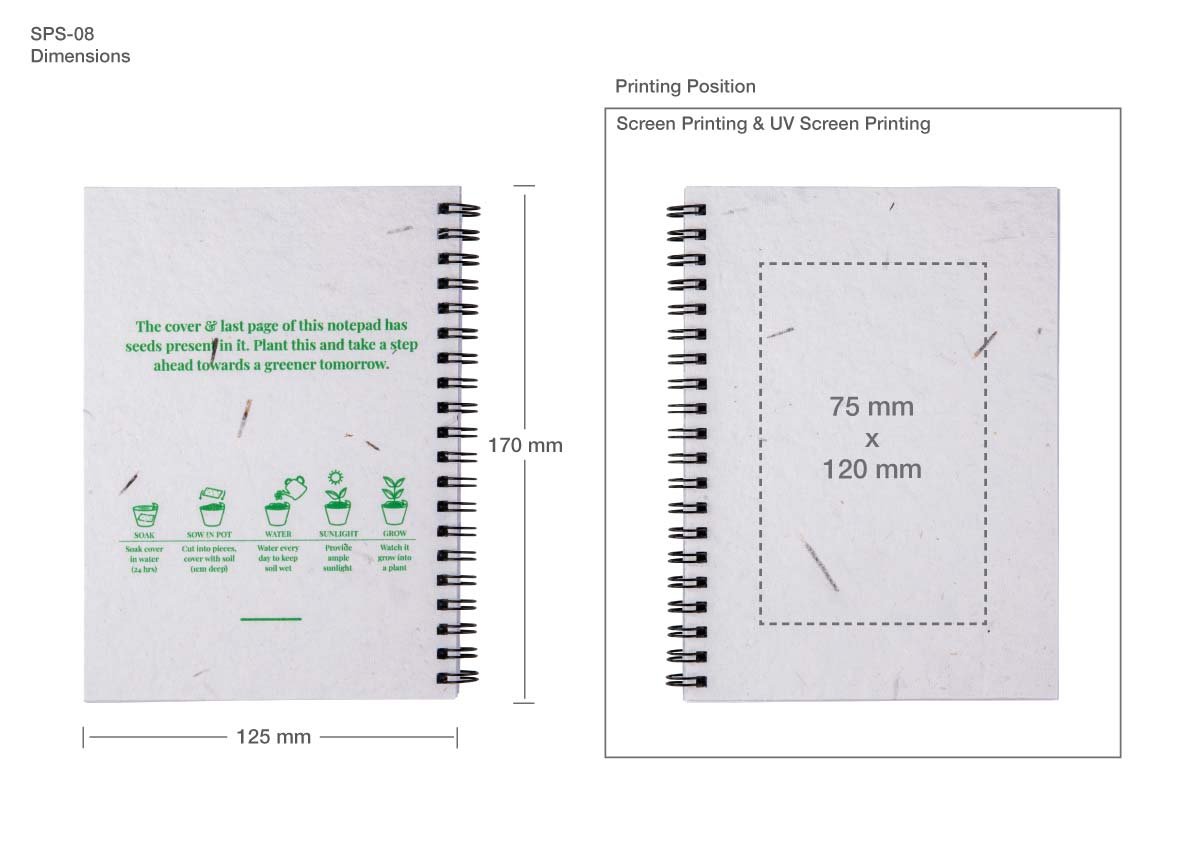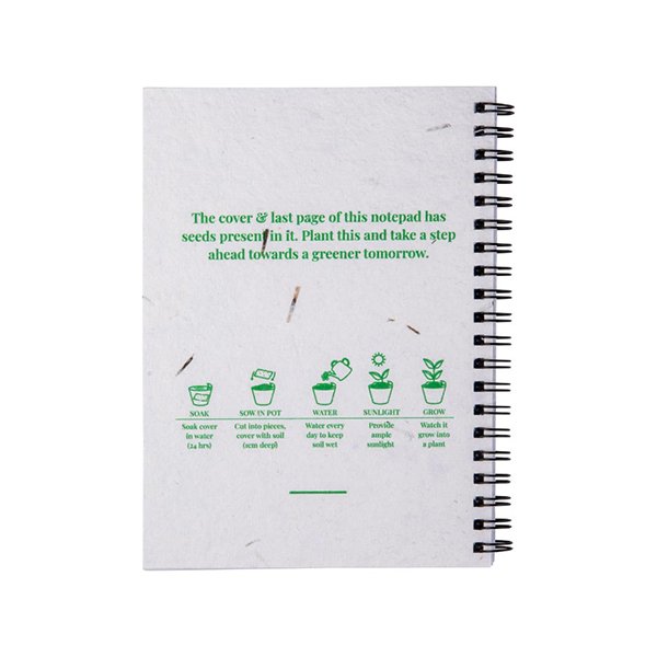 Eco-friendly B6 spiral notepad with biodegradable seed covers. 50 recycled pages, plantable covers with wildflower seeds. Ideal for sustainable gifting, journaling, and promotions.
