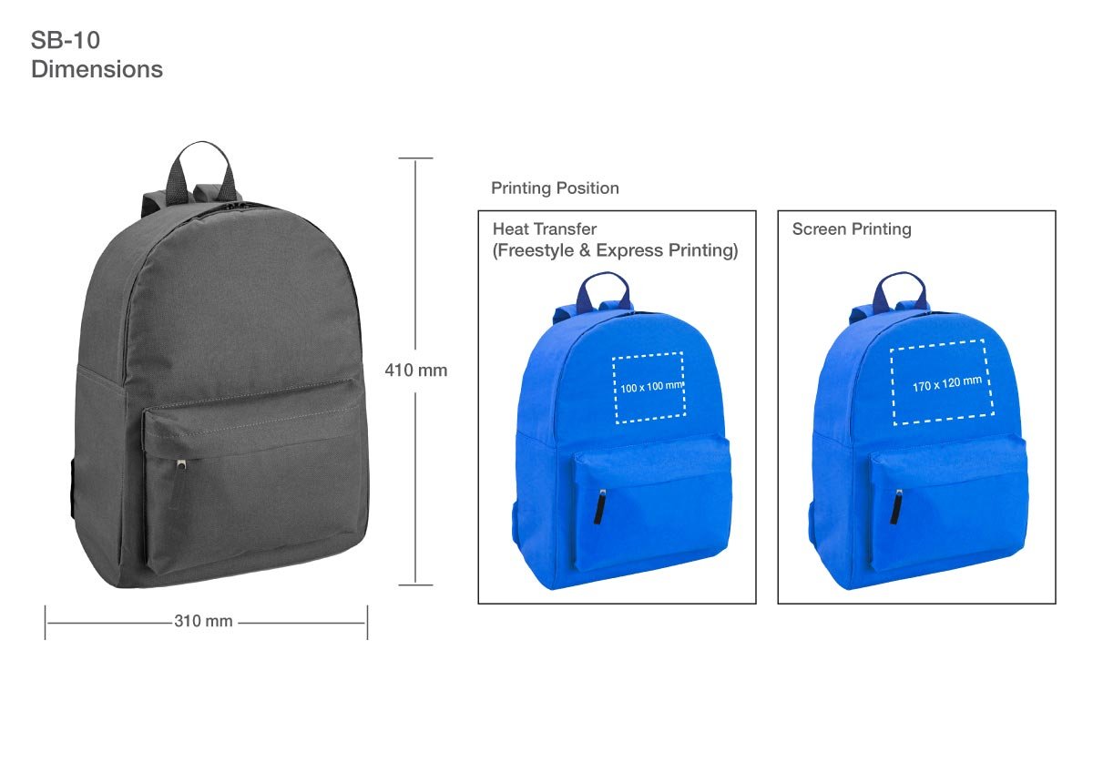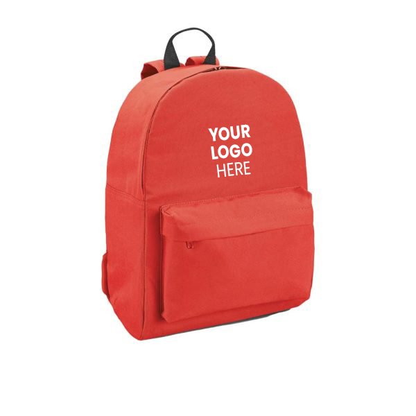 Durable polyester promotional backpacks with a main zipper compartment, front pocket, and adjustable shoulder strap. Available in multiple vibrant colors, ideal for corporate giveaways, events, and marketing campaigns.