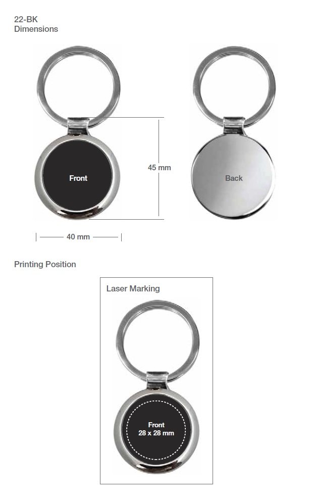 The keychain measures 45 × 40 mm and weighs 0.031 kg, making it compact, lightweight, and comfortable to carry. The round black plate provides a clean and elegant surface that enhances the visibility of engraved logos or text.