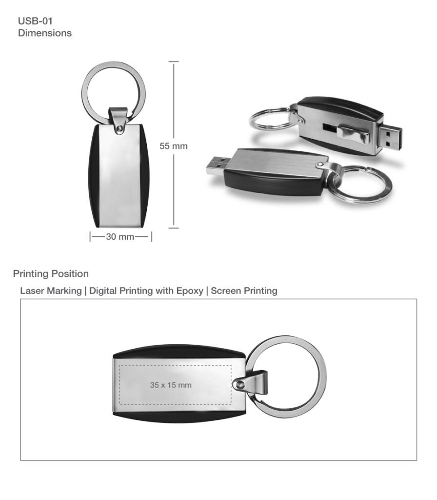 Available in 4GB, 8GB, and 16GB storage capacities, this USB flash drive is ideal for storing documents, presentations, media files, and marketing materials. It provides generous branding space and supports full-color digital printing with epoxy, laser marking, and screen printing, making your logo stand out with a professional finish.