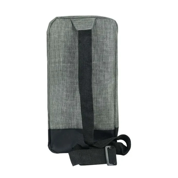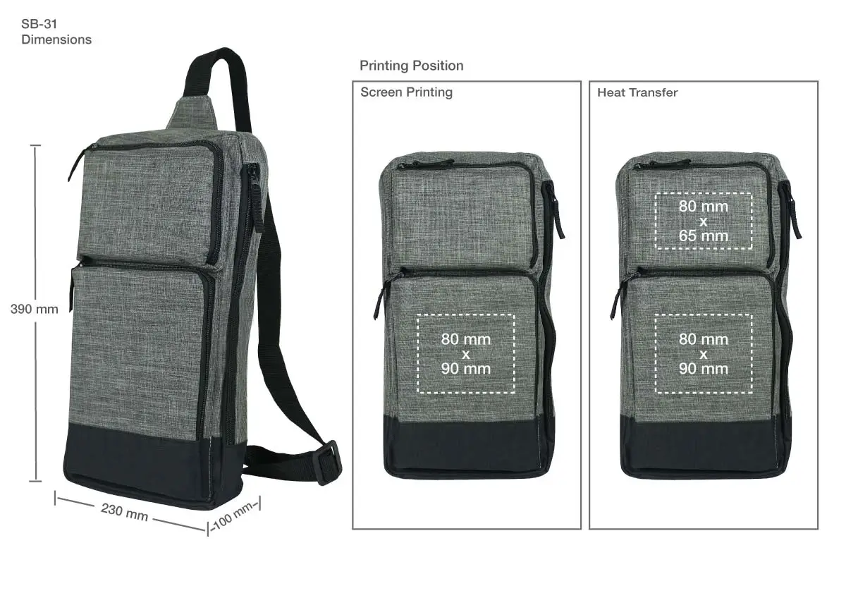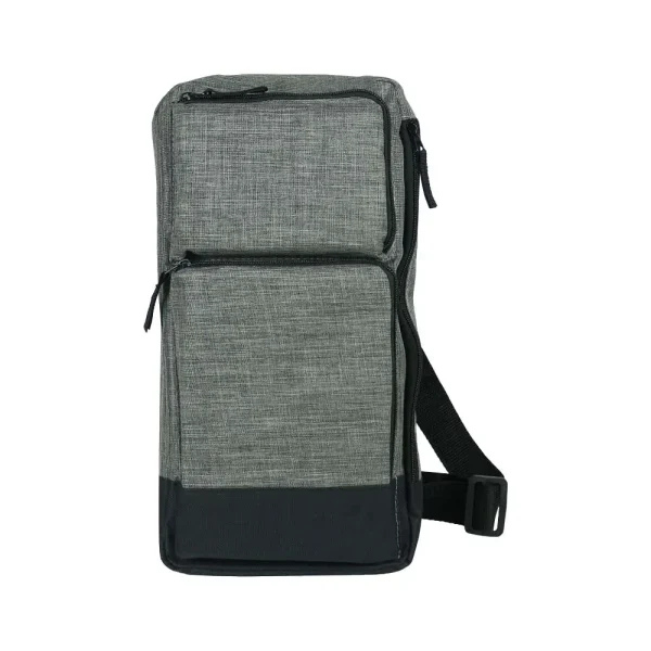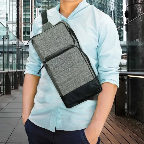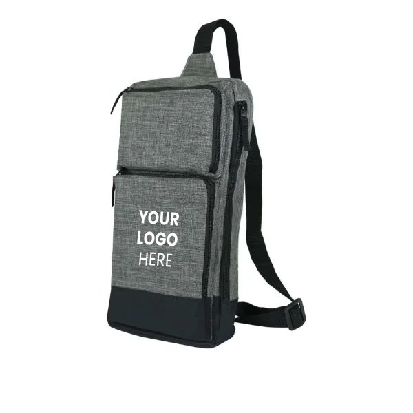 Rectangular sling crossbody bag in grey and black polyester, featuring multiple compartments, adjustable strap, and customizable branding options. Ideal for promotional use, events, or everyday carry.