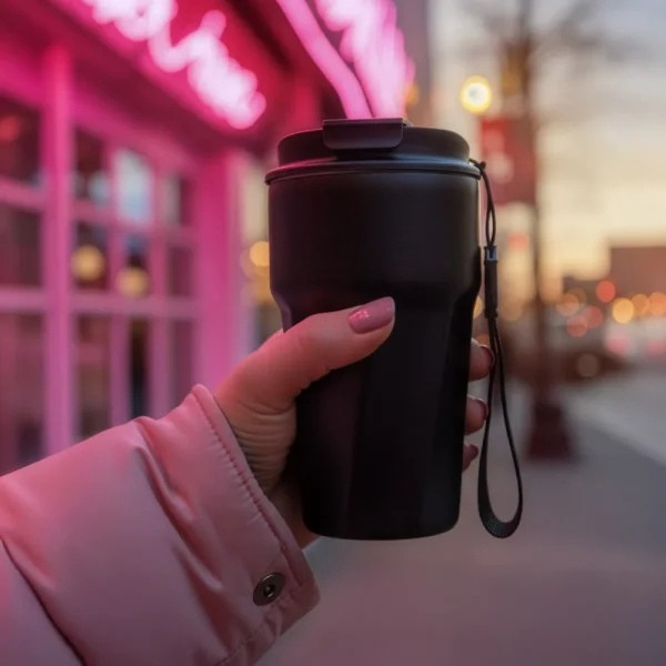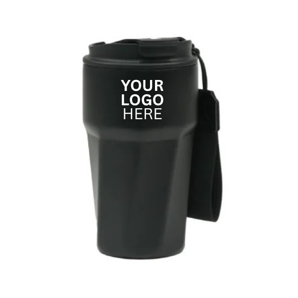480ml double-wall stainless steel tumbler with flip-top leakproof lid and short lanyard. Keeps drinks hot or cold for hours. Ideal for daily use, travel, or corporate promotional gifts. Customizable with laser, DTF, or screen printing.