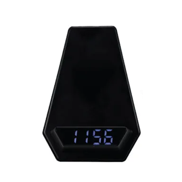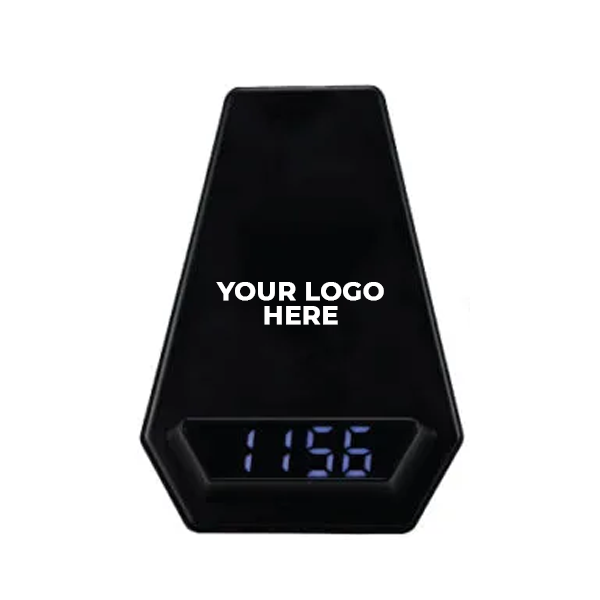 This product combines a wireless charger, Bluetooth speaker, and digital alarm clock in one sleek device. It is made from black ABS material and features a white LED light-up logo, making it a perfect promotional gift for offices and home use.
