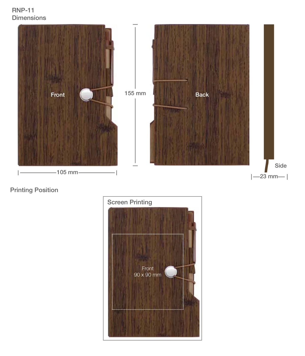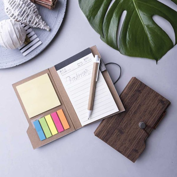 Combine creativity, functionality, and sustainability with our Wood Design Notebook with Sticky Note and Pen. Crafted from 100% recycled cardboard with a stylish dark brown wood-patterned cover, this notebook is both environmentally friendly and perfect for professional use.